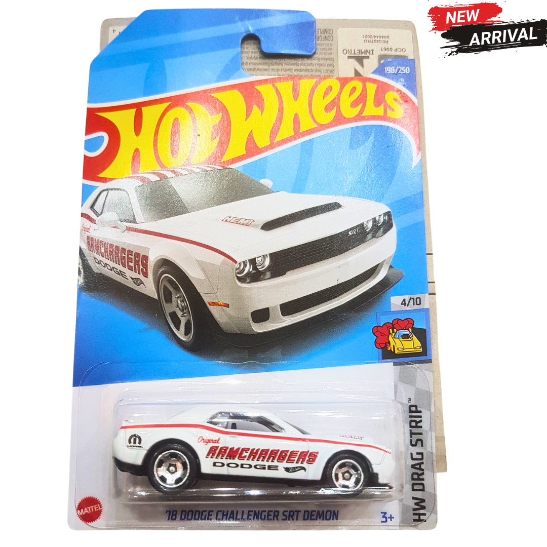Feel the power of American muscle with the Hot Wheels β18 Dodge Challenger SRT Demon β HW Drag Strip Series! This bold and aggressive white drag racer features βRamchargersβ Dodge branding and a sleek performance look, making it a standout in any collection or race.