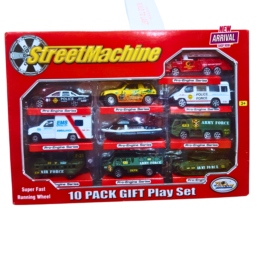 π¨ Rescue, Protect & Serve! This Street Machine 10-Pack Playset features a mix of police cars, ambulances, fire trucks, army vehicles, and even an air force carrier! Perfect for kids who love action-packed rescue and military adventures, this set is built for thrilling storytelling and imaginative play.