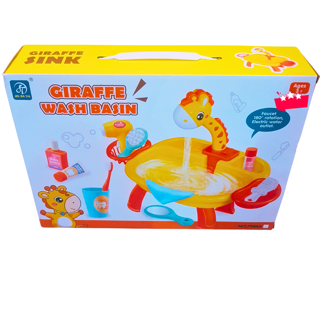 Let your child explore the joy of imaginative play with the Giraffe Wash Basin Toy Set! Specially designed for toddlers and young kids aged 3 and up, this colorful sink features a cute giraffe-shaped faucet with 180° rotation and an electric water outlet for a realistic washing experience. Packed with pretend toiletries like a baby lotion bottle, cup, toothpaste, comb, and a toy hairdryer, it’s perfect for encouraging personal hygiene awareness, role-play fun, and fine motor skill development.
