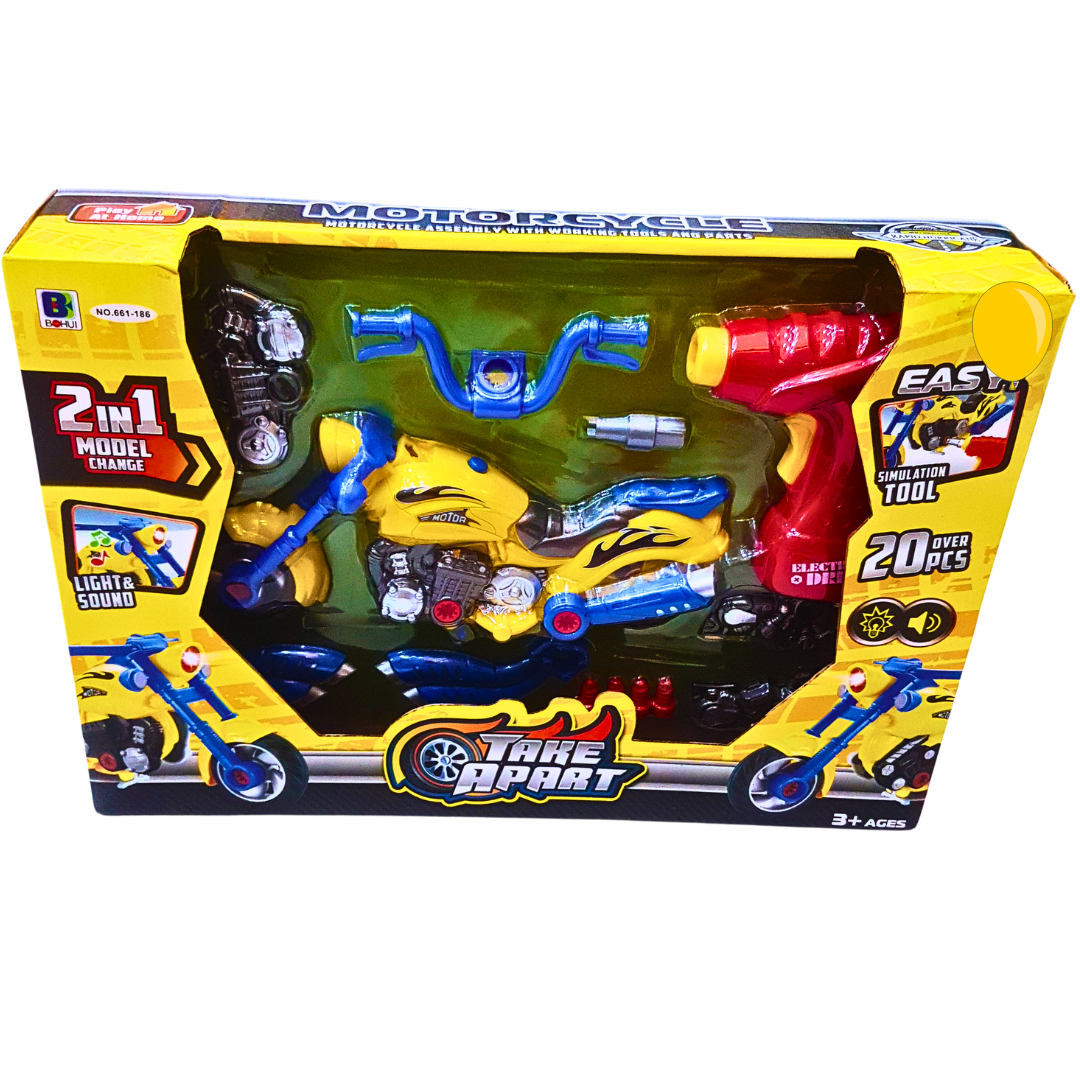 Let your child explore the world of mechanics with this 2-in-1 Take Apart Motorcycle Toy Set! With over 20 pieces, kids can disassemble and reassemble the motorcycle, learning how different parts work together. The set includes a simulation tool to make the assembly process fun and easy for little hands. This engaging set also features light and sound effects, adding to the excitement of play. Designed for children aged 3 and above, this toy promotes fine motor skills, problem-solving, and creativity.