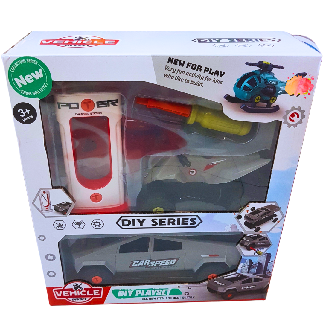 DIY Vehicle Playset - Build and Play Construction Series with Car, Helicopter, and Charging Station for Kids Aged 3+