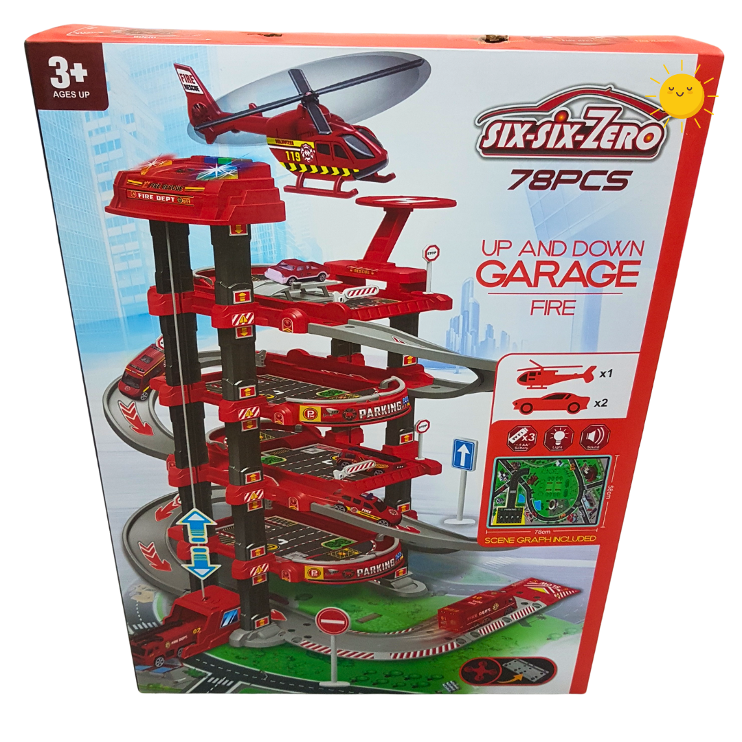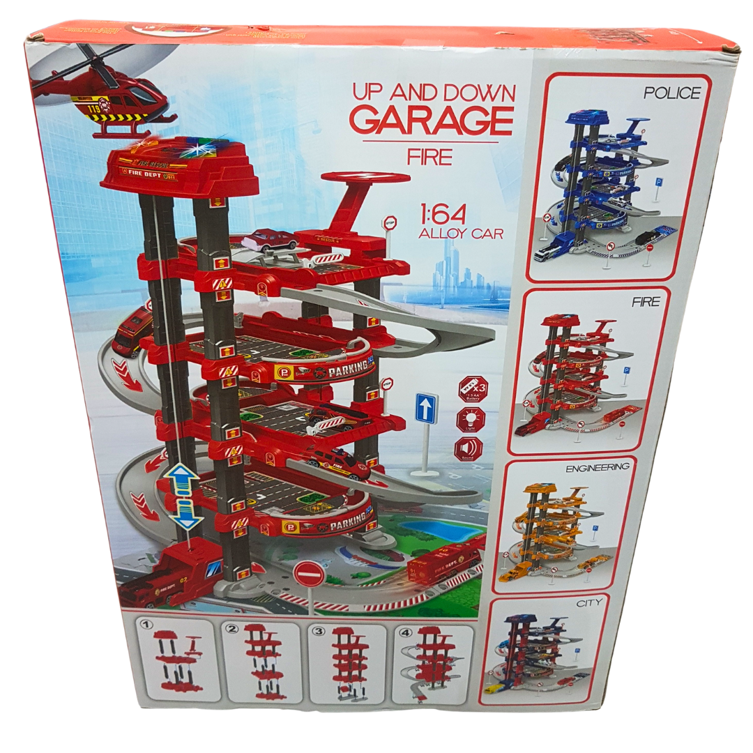 The playset's design with up and down ramps introduces kids to the concepts of vertical parking and swift emergency response, fostering their problem-solving skills and understanding of spatial relationships. Fine motor skills are engaged as little hands maneuver the vehicles, placing them in the intricately designed parking spots or on the elevator.
