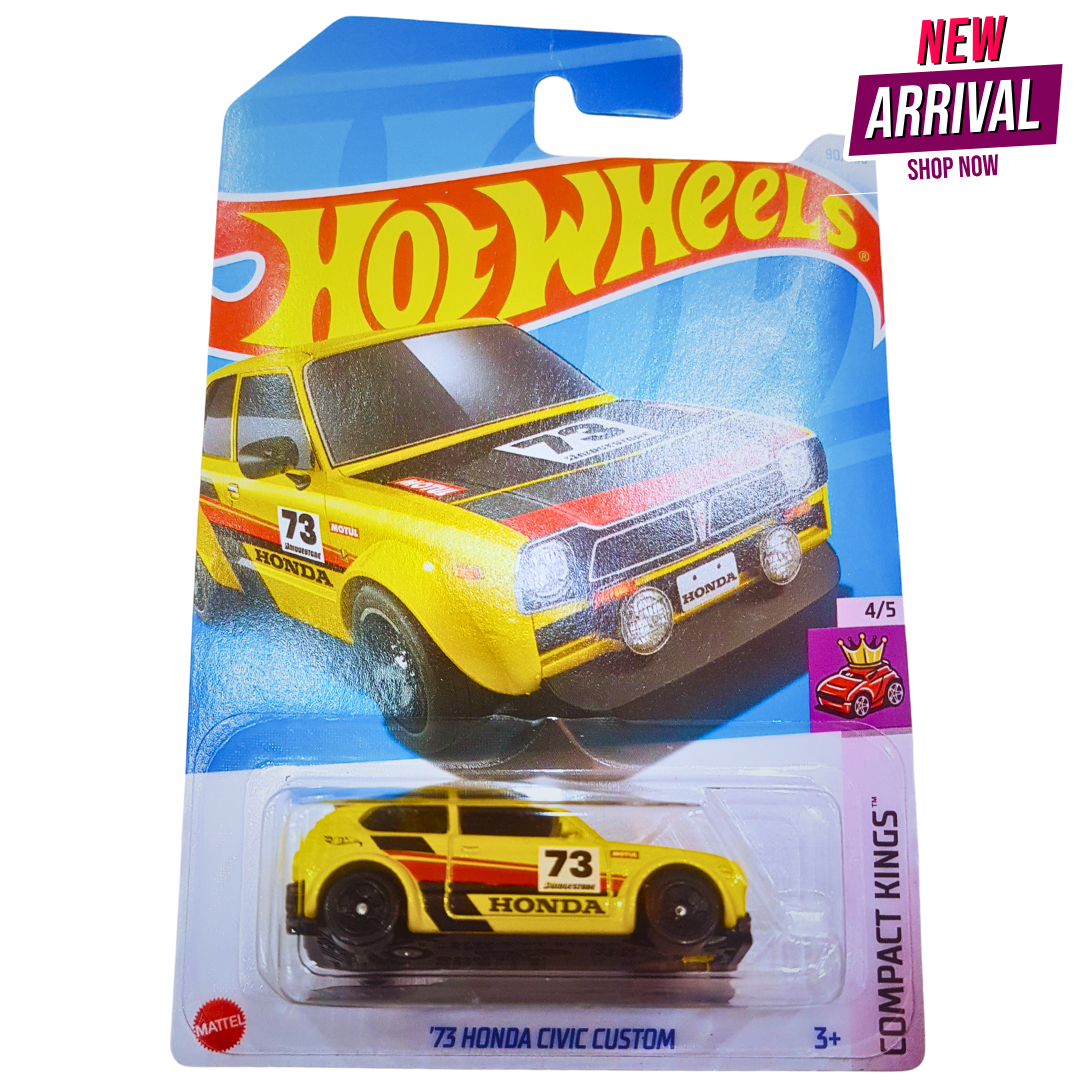 Buy Hot Wheels '73 Honda Civic Custom from the Compact Kings Series 2024. Yellow JDM hatchback with racing graphics. Available at One Toy Store Pakistan.