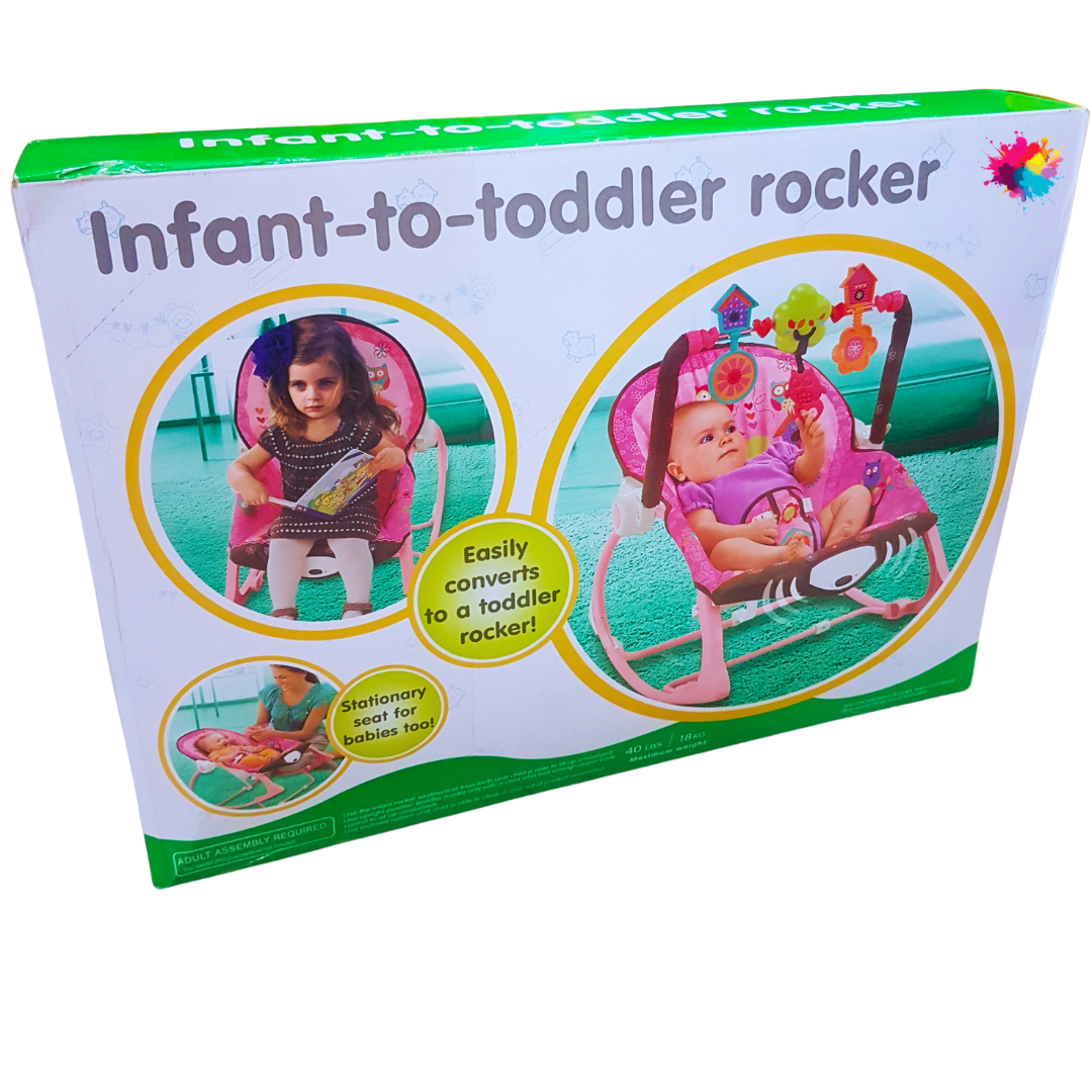 Provide your child with a secure and comforting environment with our Infant-to-Toddler Rocker. Designed to grow with your little one from infancy to toddlerhood (up to 18kg/40 lbs), this rocker features a deep cradle seat with soothing vibrations to comfort and calm younger babies. The vibrant, playful design is complemented by a sensory pull-down owl that plays music and bat-at flowers that stimulate your baby’s senses.