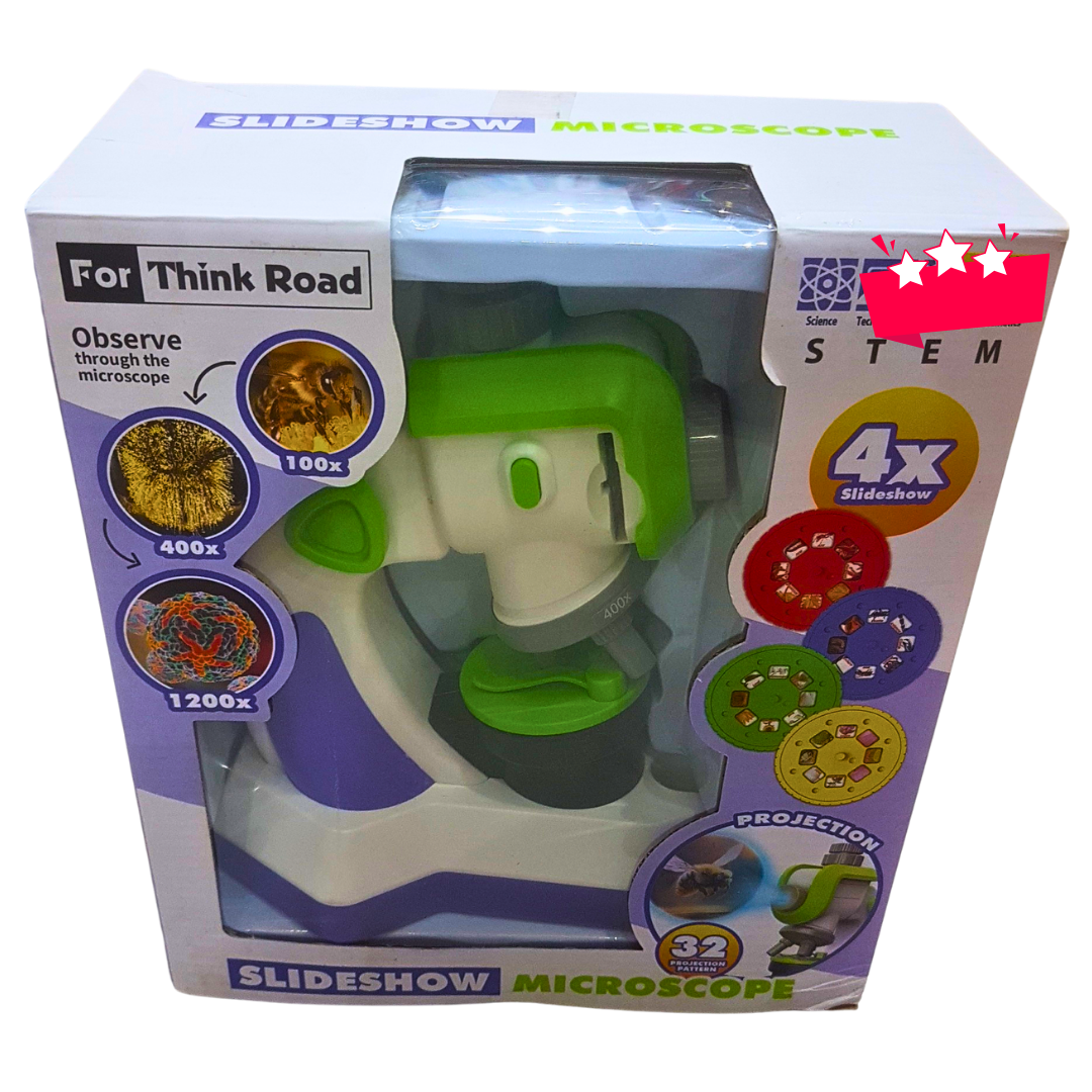 Introduce your child to the wonders of science with the Slideshow Microscope for Kids, a STEM educational toy designed to spark curiosity and learning. With 3 magnification levels (100x, 400x, 1200x) and 32 fascinating slide projections, this microscope helps young minds explore the microscopic world in vivid detail. The set includes 4 color-coded slide discs with engaging samples, an easy-to-use eyepiece, slideshow knob, and projection lens that displays images on a wall or surface. It's perfect for children aged 6 and up to develop observation skills, scientific thinking, and hands-on learning.