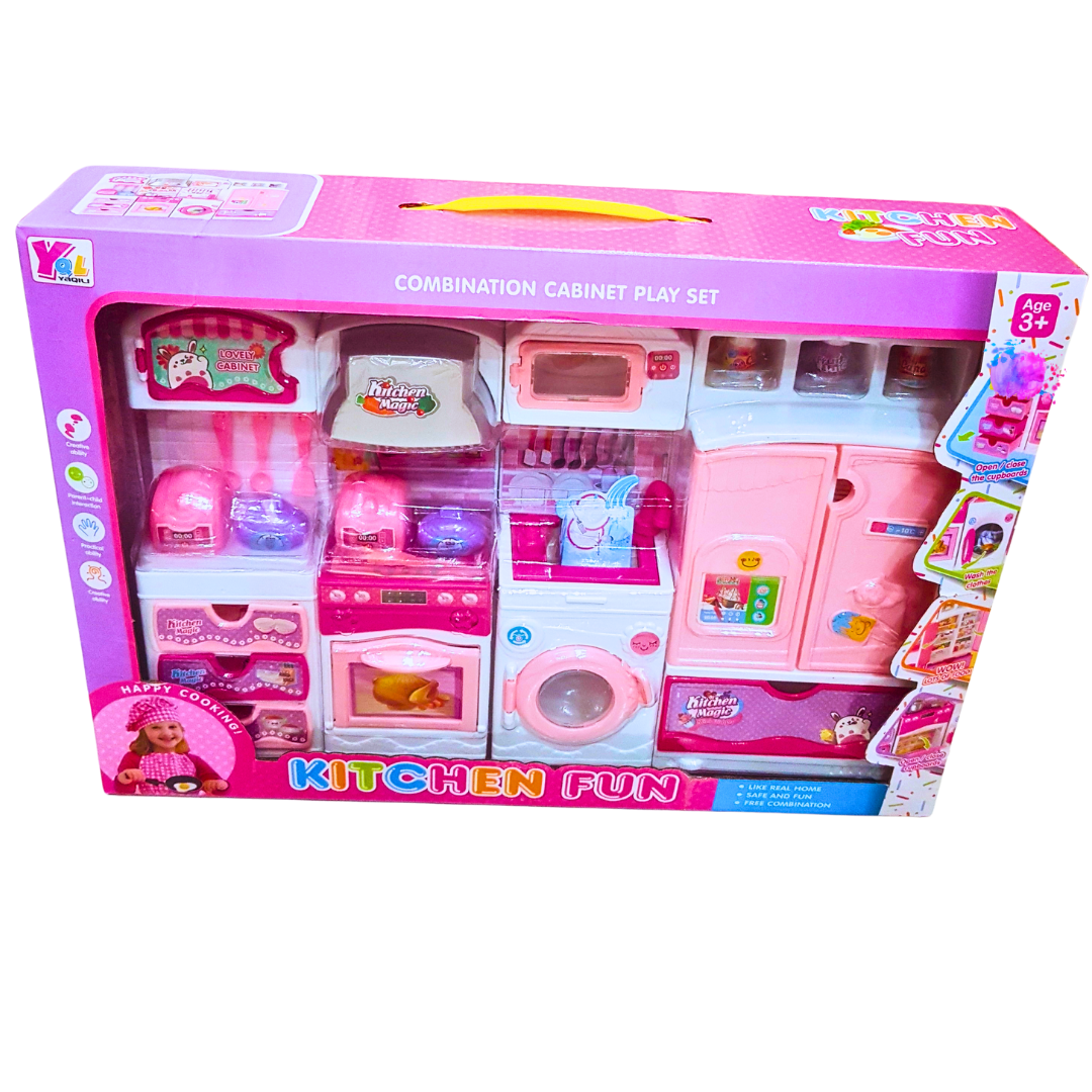 Unleash your child's inner chef with the **Kitchen Fun Combination Cabinet Play Set**! This ultimate kitchen playset is packed with everything young cooks need to create their own pretend meals and run their own little kitchen. Designed with vibrant colors and realistic details, this playset offers a fully immersive experience that encourages creativity, role-playing, and hours of fun.