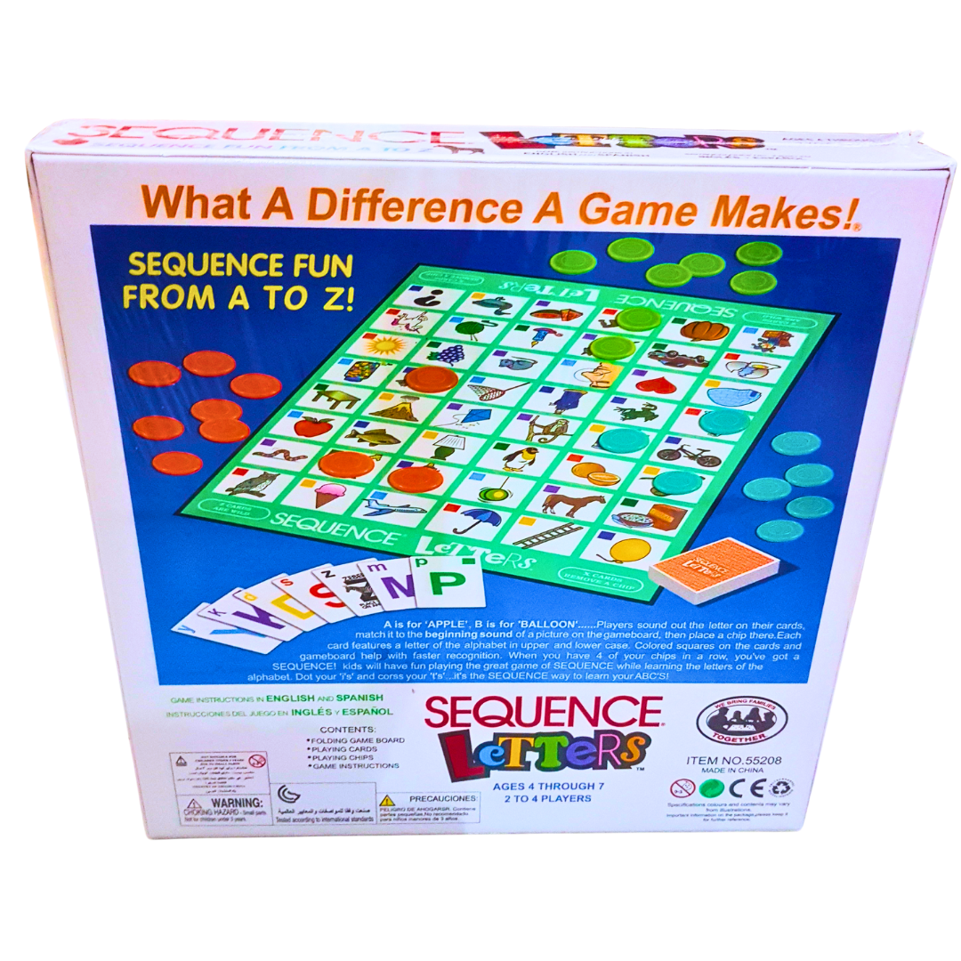 Perfect for young learners, **Sequence Letters** supports early literacy and improves focus as kids identify letters and their corresponding sounds. The bright, colorful board and easy-to-hold chips make it ideal for little hands, while the simple rules ensure everyone in the family can join in. It’s a fantastic educational tool for play at home, in the classroom, or during family game night.