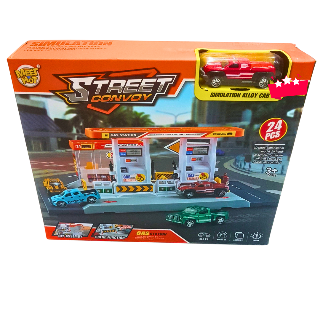 Street Convoy 24-Piece Gas Station Toy Set – DIY Assembly with Alloy Cars, Fuel Pumps & Stickers | Pretend Play Vehicle Station (Ages 3+)