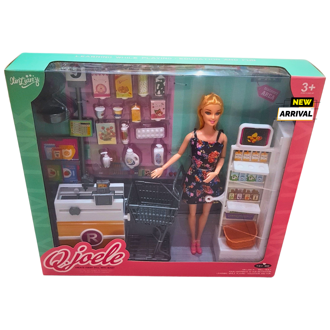 QJoele Supermarket Playset with Doll – Grocery Shopping Toy with Trolley, Cash Register & Accessories – Pretend Play for Kids (3+ Years)