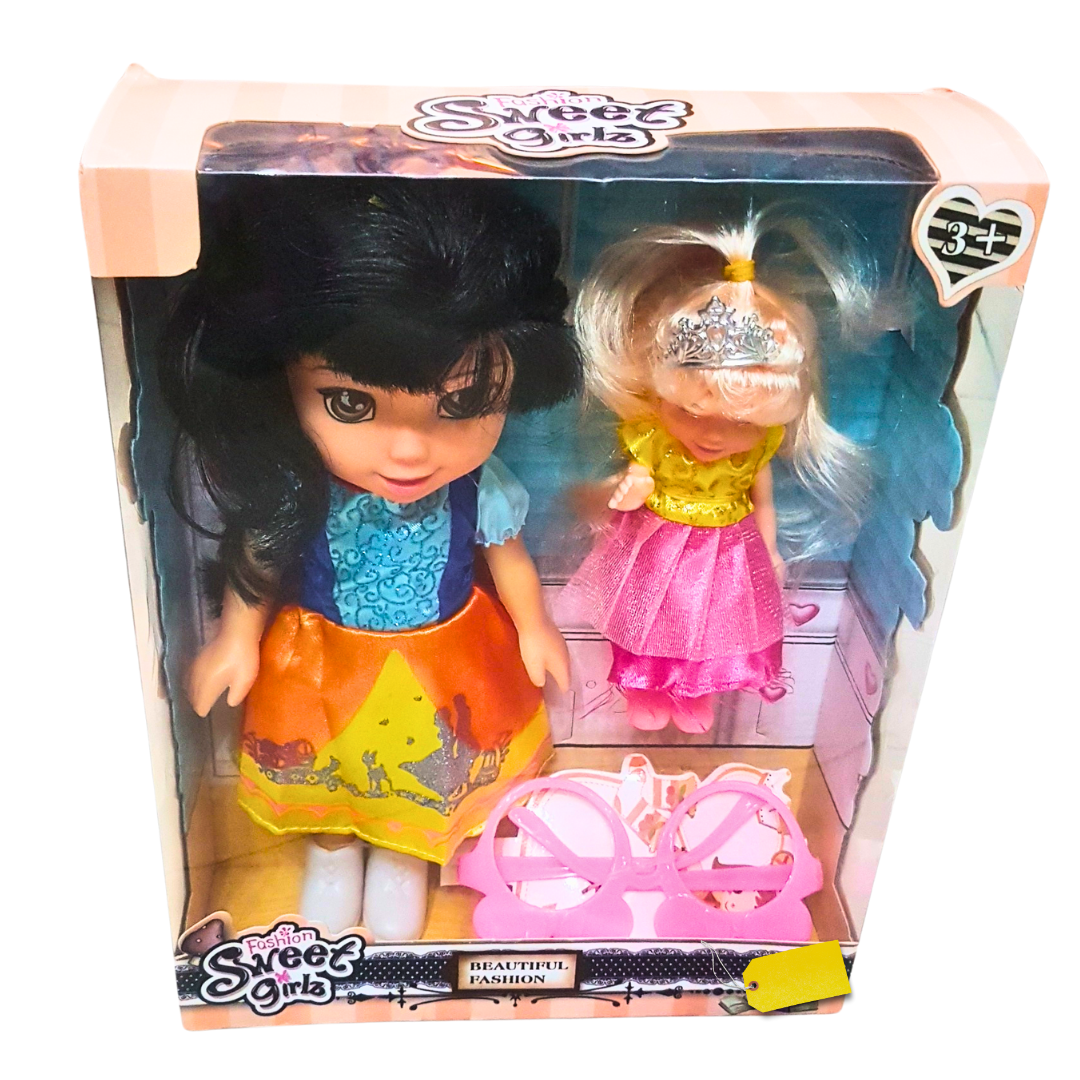 Make playtime extra special with the Sweet Girls Doll Set, featuring two adorable dolls dressed in vibrant outfits and fun accessories. The larger doll showcases a stunning blue and orange dress with intricate details, while the smaller doll sparkles in a pink and yellow ensemble, complete with a tiara. This set also includes a pair of stylish sunglasses to enhance the fun!
