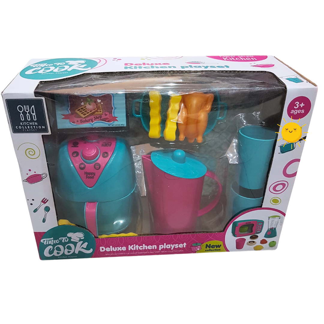 Ignite your child's culinary passion with the "Time to Cook" Deluxe Kitchen Playset, a vibrant and inviting toy set that's perfect for young chefs aged 3 years and older. This delightful set features a modern kitchen collection, including a bright teal mixer, a pink and teal kettle, utensils, and more, all designed to create a realistic cooking experience.