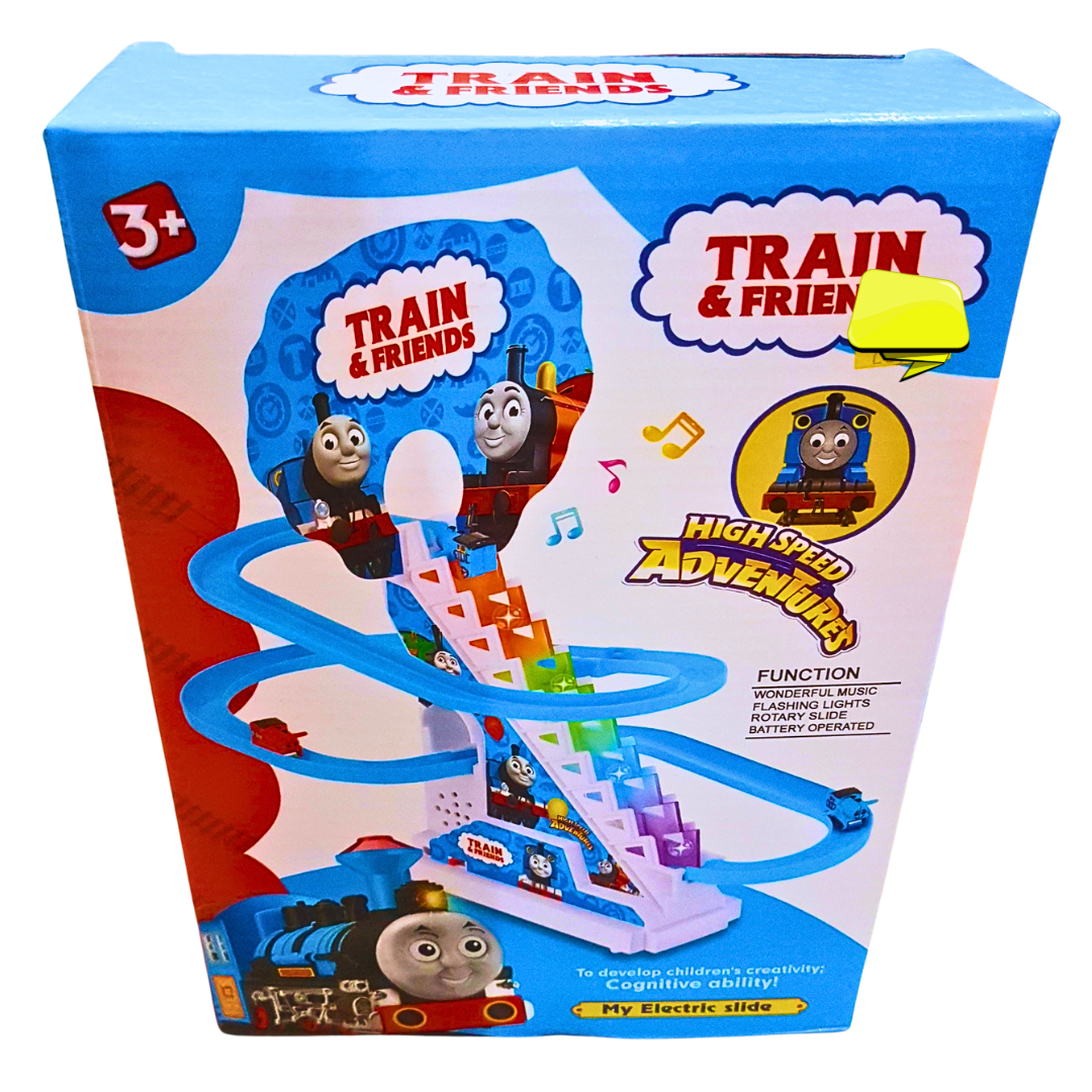 All aboard for fun and learning with the Train & Friends Musical Slide Playset! This exciting battery-operated playset features vibrant tracks, cheerful music, flashing lights, and an automatic escalator that brings the trains to the top for a thrilling ride down. Perfect for imaginative play, this set brings high-speed adventures to life while enhancing cognitive skills, hand-eye coordination, and creativity.
