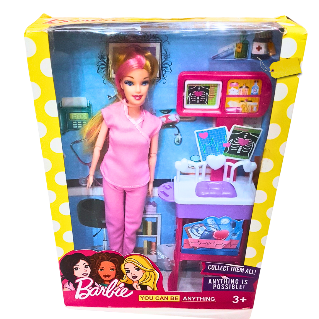 Product Description: Inspire your child's dreams with the Barbie Doctor Playset, featuring Barbie dressed in professional scrubs and equipped with a full set of medical tools. The set includes a patient bed, X-ray display, medical charts, and other accessories to encourage imaginative play and introduce kids to the exciting world of healthcare. Barbie's motto, "You Can Be Anything," encourages children to explore their aspirations.